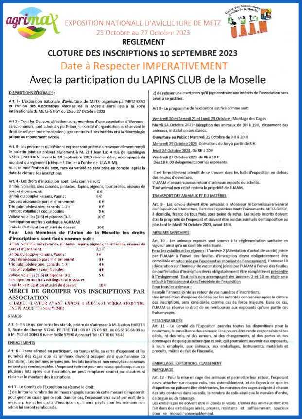 à l'exposition de nos amis de Fontoy-Richement, un prix spécial offert par le Lapins club de la Moselle sera attribué à ses membres en fonction du nombre de sujets inscrits