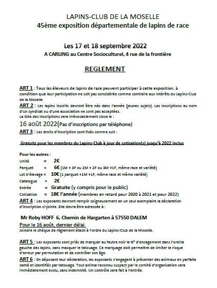 règlement et feuille d'inscriptions à l'exposition jeunes sujets, du lapins club de la moselle